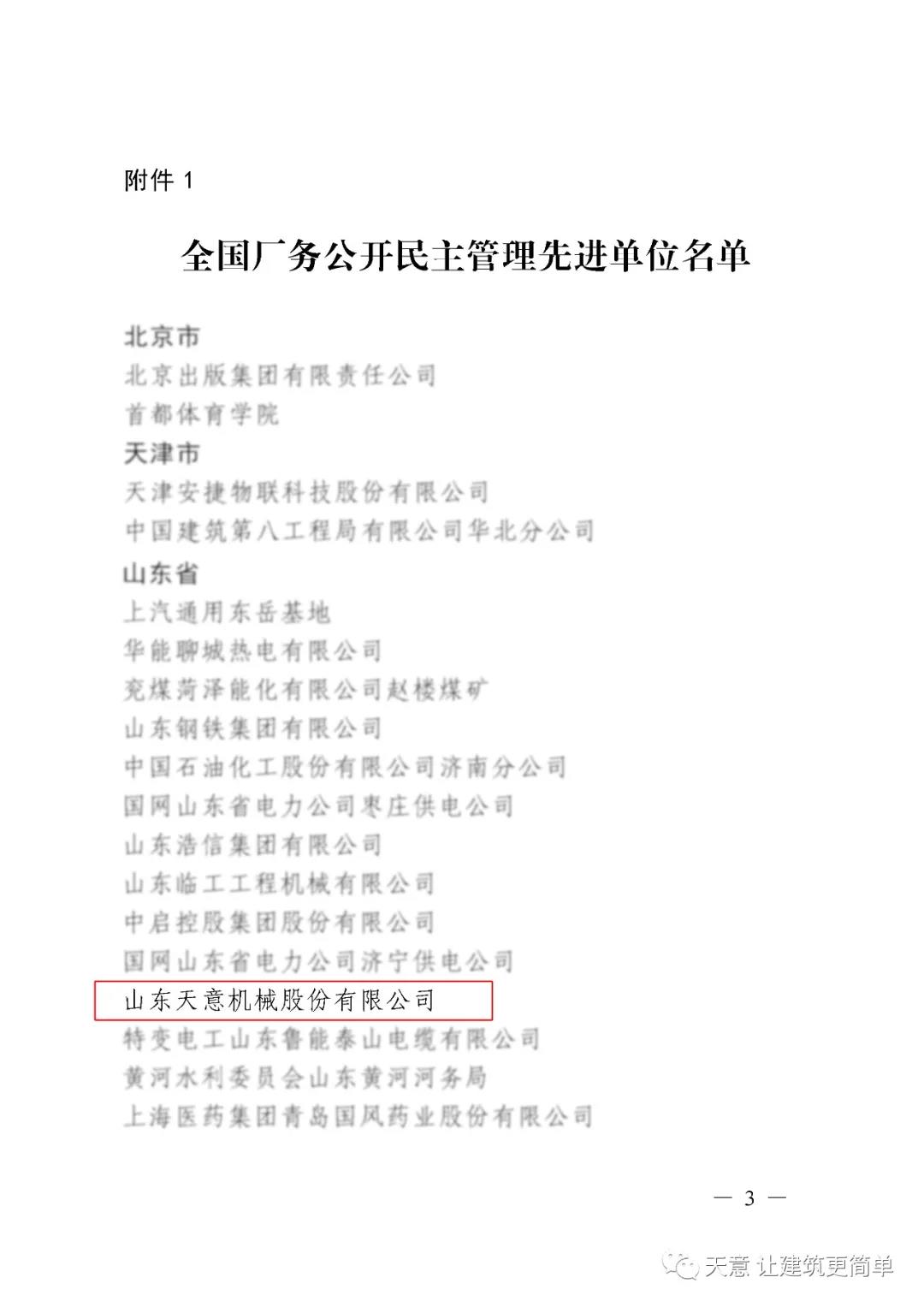喜訊丨祝賀天意機械被授予“全國廠務(wù)公開民主管理先進單位”稱號